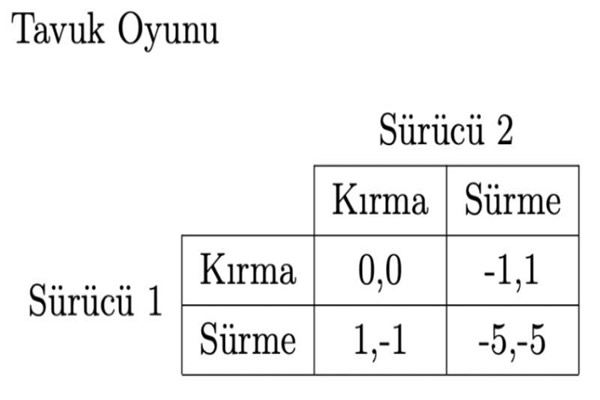 Tavuk Oyunu, iki oyuncunun birbirine karşı geri adım atmama stratejisini izlediği bir oyun modelidir. Bu oyun, genellikle nükleer caydırıcılık ve benzeri stratejik durumları analiz etmek için kullanılır. Örneğin, iki ülke arasında gerilim yükseldiğinde, her iki ülkenin de geri adım atmamakta direnmesi durumunda ortaya çıkabilecek sonuçları değerlendirmek için tavuk oyunu modeli kullanılır. Bu model, stratejik hesaplaşmaların ve çatışma durumlarının önemli bir analitik aracı olarak karşımıza çıkıyor.